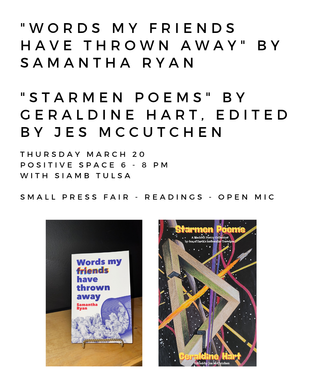 Join us for the book launch of "words my friends have thrown away" by Sam Ryan and "Starmen Poems" by Jes McCutchen. These two Tulsa writers will be releasing their books at the Positive Space art gallery featuring the installation "Geraldine Hart: A Restrospective" by Jes McCutchen.